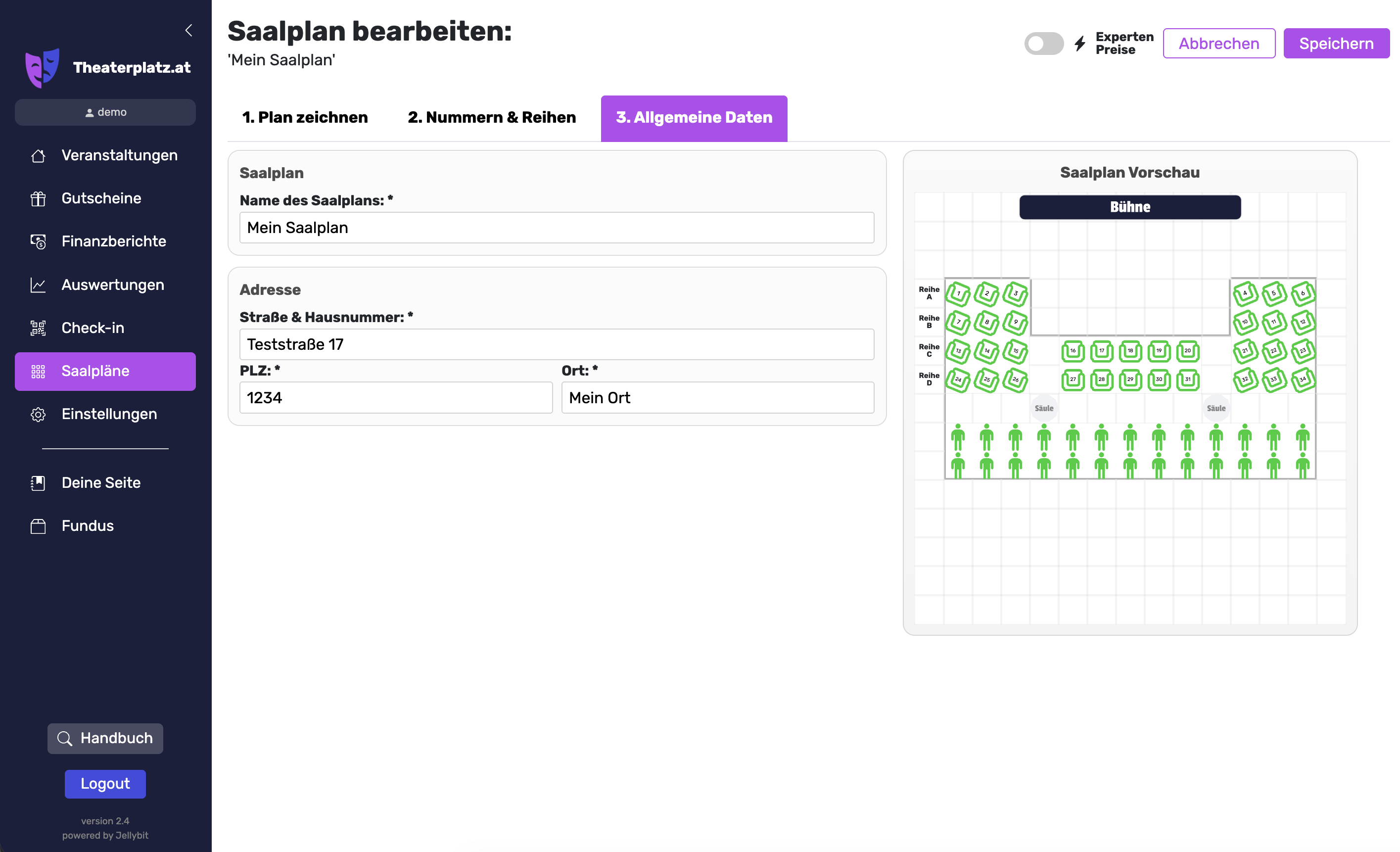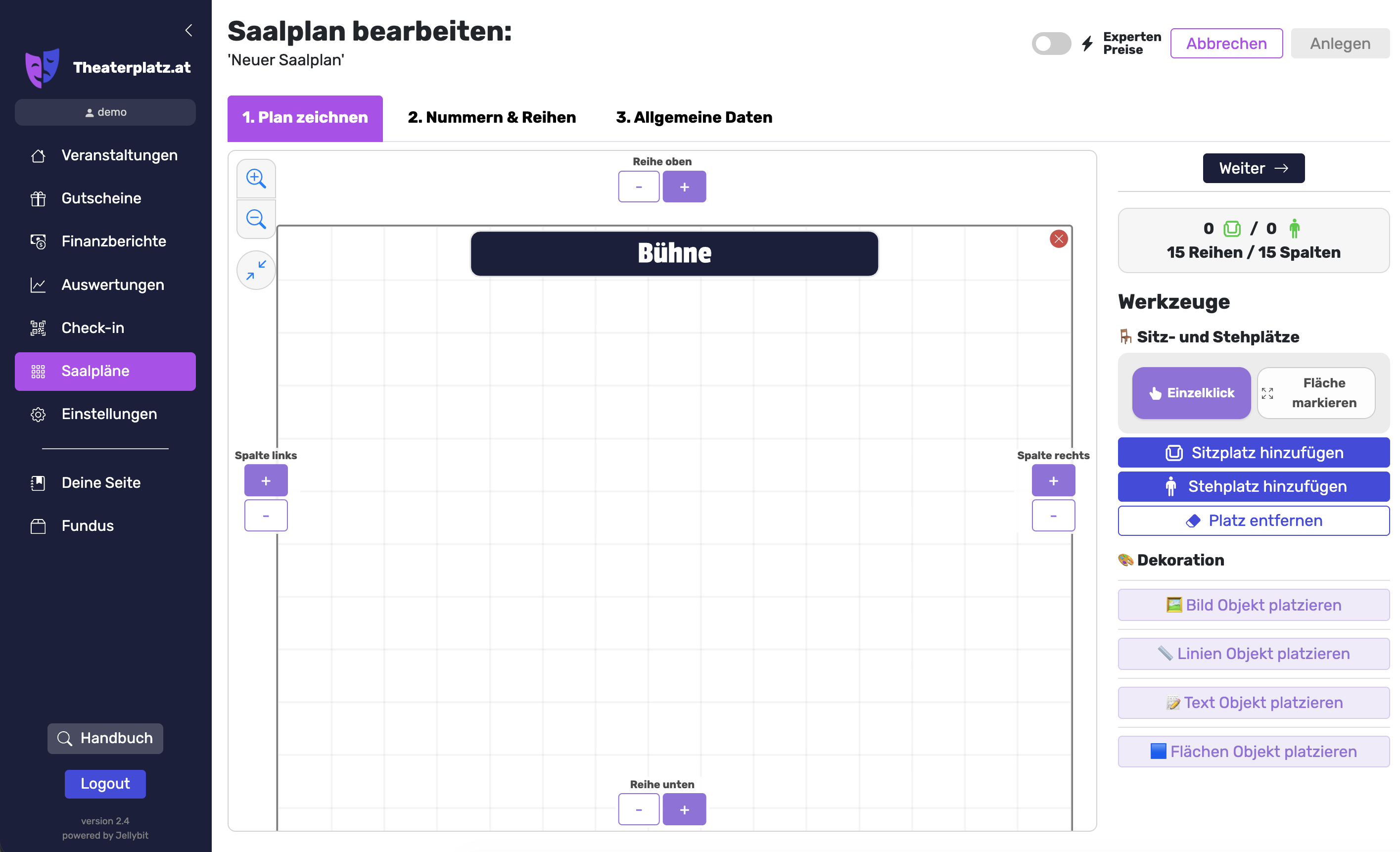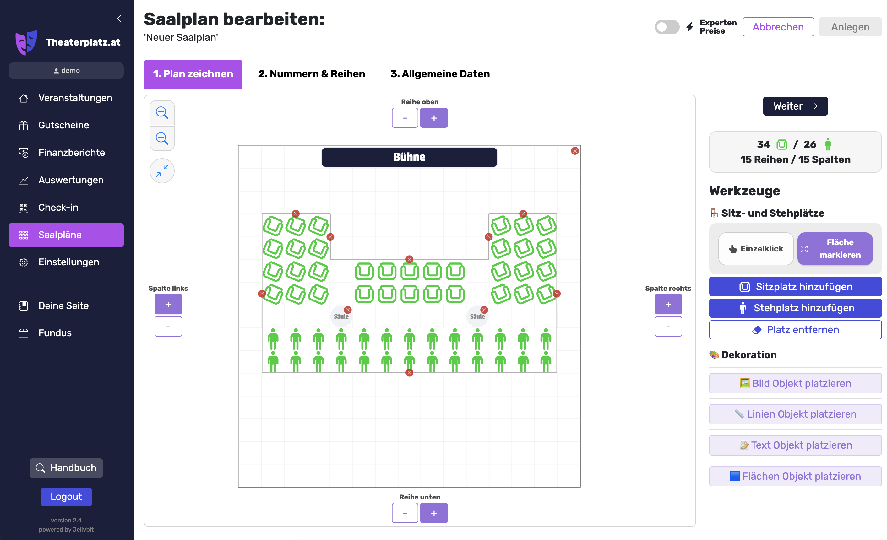 In diesem Abschnitt gehen wir genauer auf die Funktionen des Saalplan-Editors ein: Wie man Saalpläne erstellt bzw. verwaltet und wie man den Experten-Modus richtig verwendet.