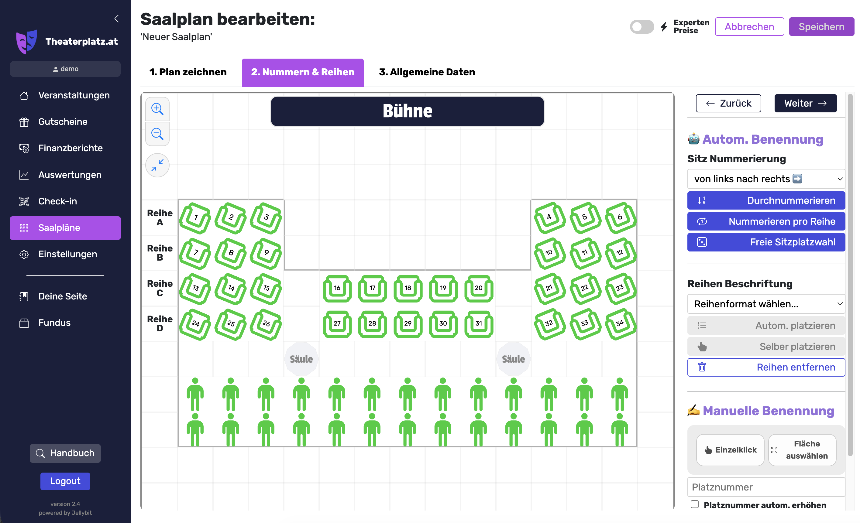 Ist der Saalplan fertig aufgebaut, drücken wir oben rechts auf Weiter und wechseln zum nächsten Schritt, wo die Sitzplatznummern und Reihenbeschriftungen festgelegt werden.